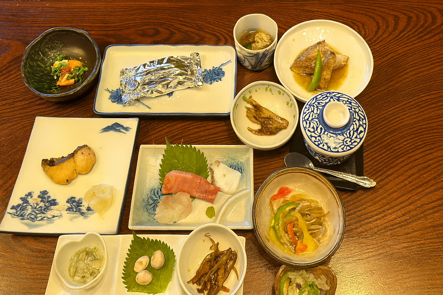 料理(焼魚・酢の物・煮魚など4種類とお椀物)